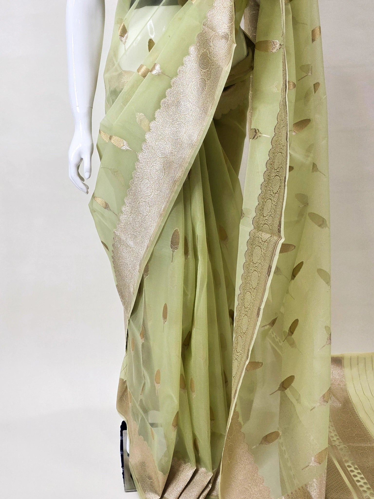 A symphony of elegance and heritage, this light green Banarasi Kora Organza saree is a masterpiece of timeless beauty. The delicate translucence of organza blends seamlessly with intricate zari weaves, creating a regal yet airy drape. Adorned with traditional Banarasi motifs and a lustrous golden border, this saree is perfect for festive occasions, weddings, and celebrations. Graceful, lightweight, and effortlessly royal – a must-have for every saree connoisseur.