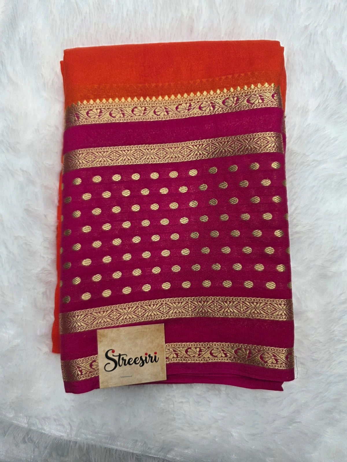 It features an orange top section, followed by a rani pink body with gold polka dots and patterned borders. Sarees are a traditional garment worn by women in India.