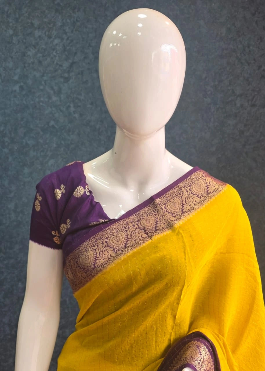 A vibrant blend of sunshine and royalty, this yellow and purple chiffon crepe saree drapes like a dream. The soft, lightweight fabric flows effortlessly, while the contrasting hues add a striking elegance—perfect for festive occasions or a chic daytime look.