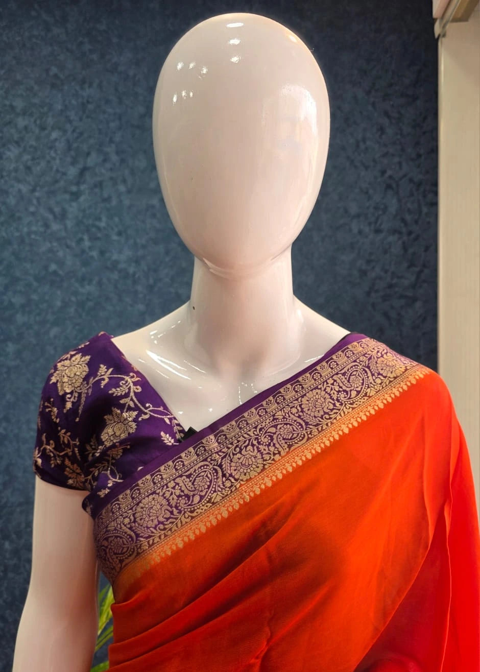 This saree appears to have a vibrant orange body, possibly made of silk or a similar material. The border is a rich purple with intricate gold detailing, featuring paisley-like designs.