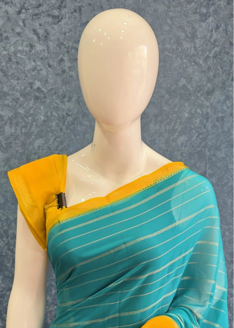 The saree very smooth texture, the body is blue with gold stripes and a yellow combination.