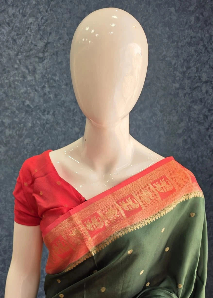 A saree features a bottle green body with small floral motifs, a golden zari border with intricate patterns, and a pink bottom border. Handloom sarees are known for their unique designs and softer texture compared to powerloom sarees.