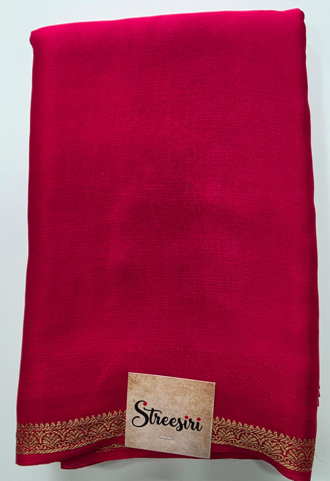 The saree is a red Mysore silk saree with a golden border. Mysore silk sarees are known for their soft texture, lightweight feel, and vibrant colors. They are made from pure crepe silk and often feature gold zari work.