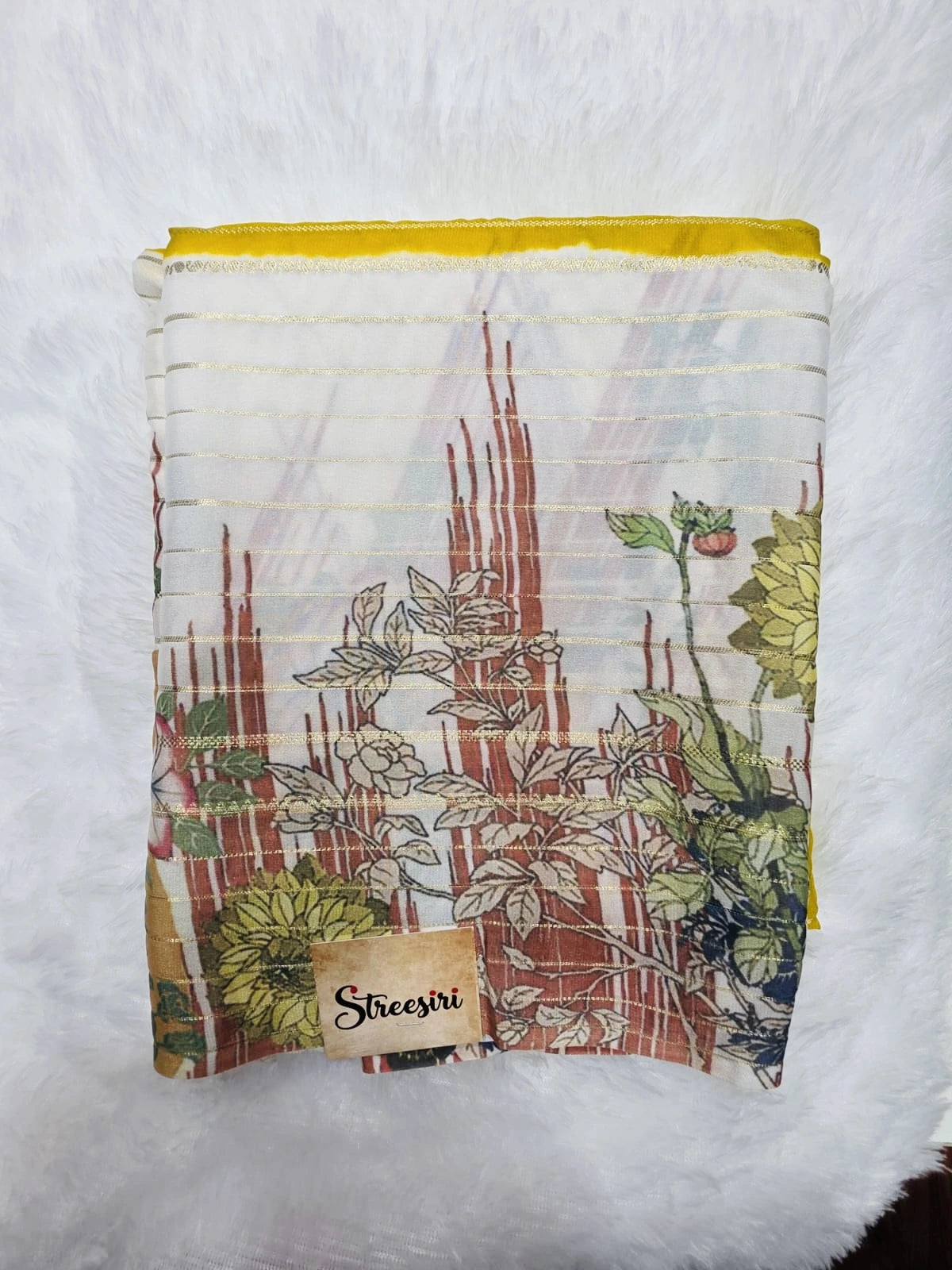 This saree features a vibrant yellow upper portion adorned with horizontal gold stripes. Below this, a white section is present, also with horizontal gold stripes, and embellished with brown patterns and a green and yellow floral design. The overall impression is a blend of traditional and modern elements, with a noticeable contrast between the yellow and the softer white.