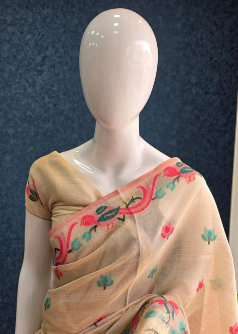 This is an elegant beige linen saree featuring intricate floral embroidery that enhances its delicate charm. The lightweight fabric drapes beautifully, making it a perfect choice for casual outings, festive gatherings, and summer wear. The saree is adorned with hand-embroidered vines and blossoms in soft shades of pink, green, and black, giving it a graceful and artistic appeal.