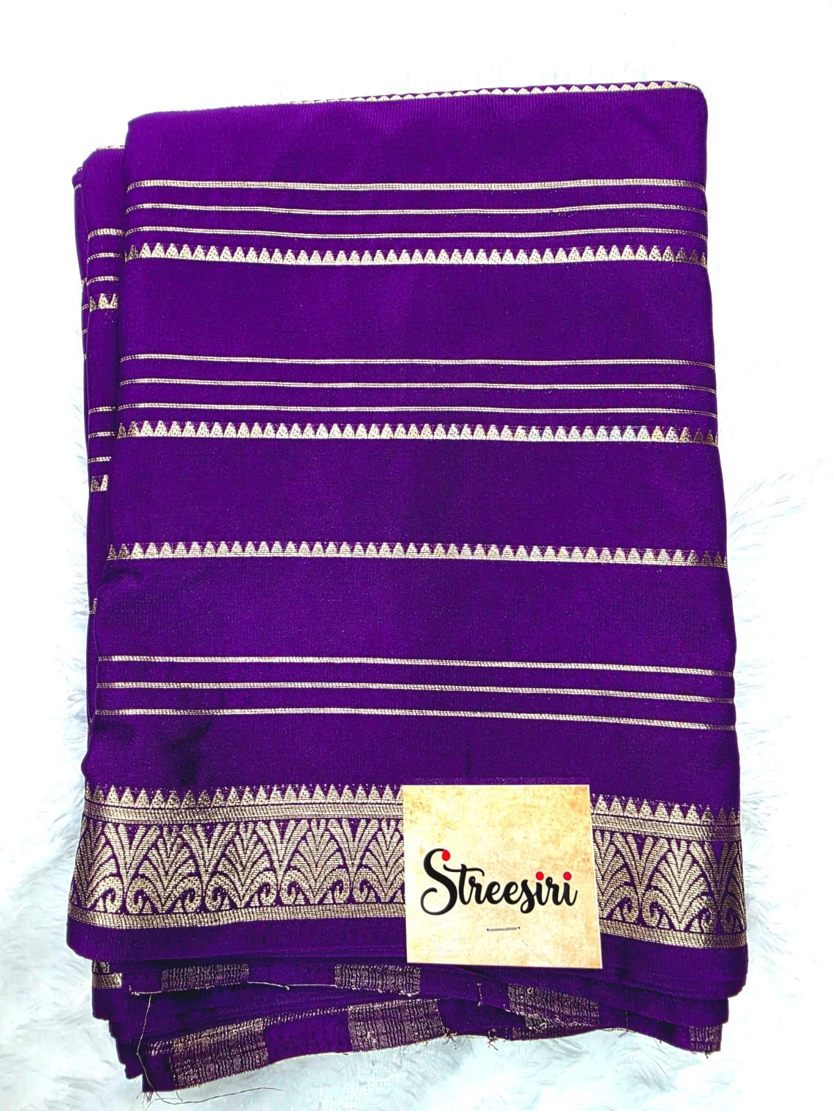 Grace meets grandeur in this purple semi-Mysore crepe saree, adorned with exquisite gold zari work. Effortlessly elegant, it drapes like a dream, making every moment timeless.