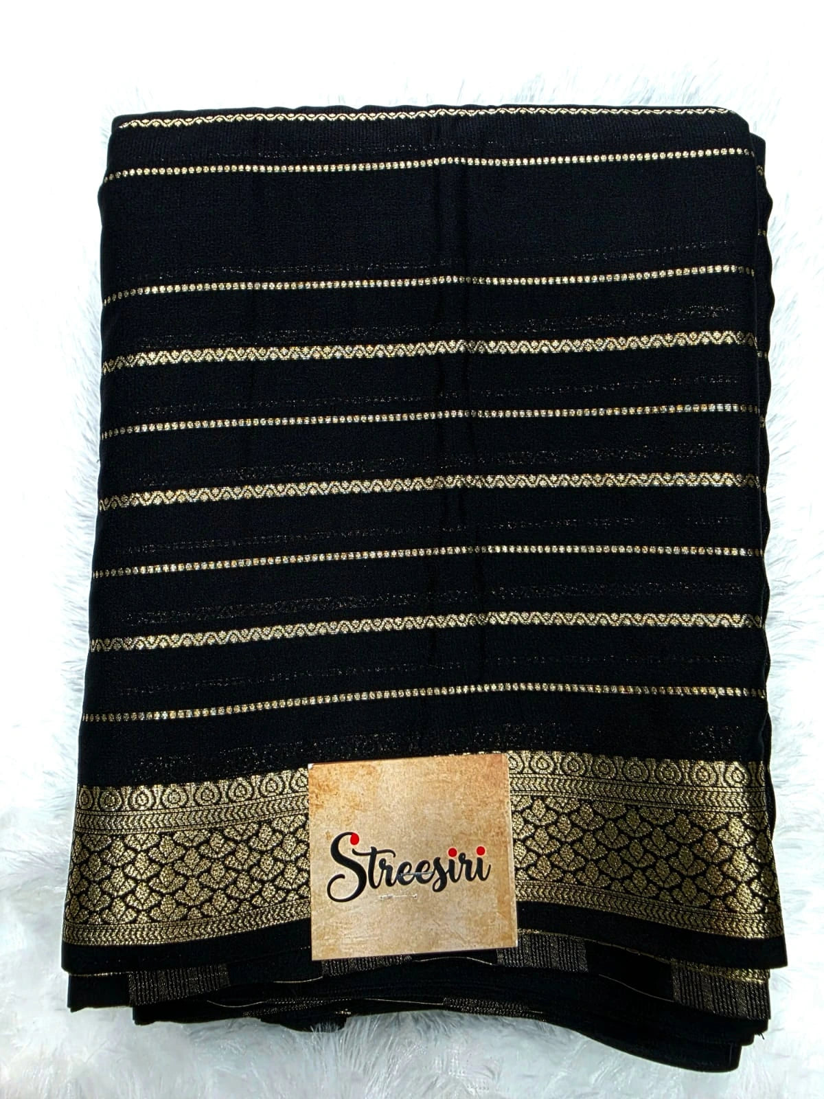 Grace meets grandeur in this black semi-Mysore crepe saree, adorned with exquisite gold zari work. Effortlessly elegant, it drapes like a dream, making every moment timeless.