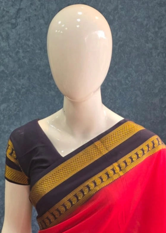 The saree is characterised by smooth texture and a rich colour combination. The saree features a Red body, a deep navy blue border, and intricate gold zari work.