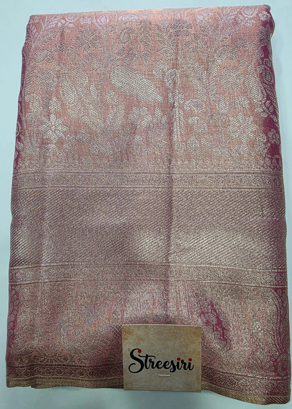 The saree is a rich texture, with intricate designs, and the use of fine silk and zari work. The saree appears to be predominantly pink with silver or gold zari detailing, featuring traditional motifs such as floral patterns and possibly peacock or parrot motifs in the border.